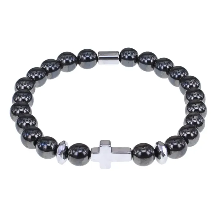 Христианский браслет Крест с синт.камнем Гематит (не магнит.) 8мм BSH-14-28