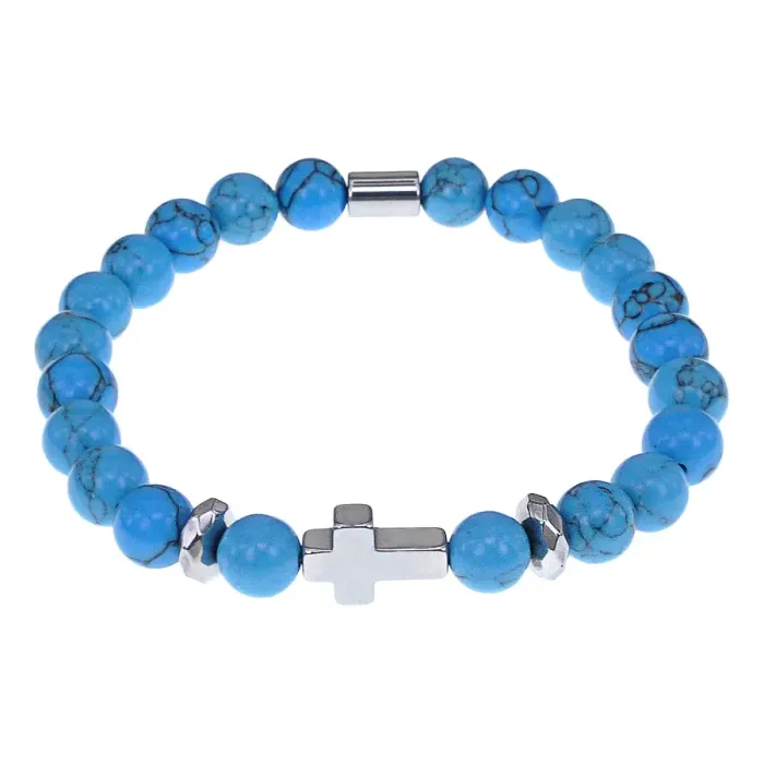 Христианский браслет Крест с синт.камнем Бирюза 8мм BSHE-14-05