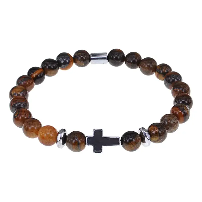 Христианский браслет Крест с нат.камнем Тигровый глаз 8мм BSHE-14-19