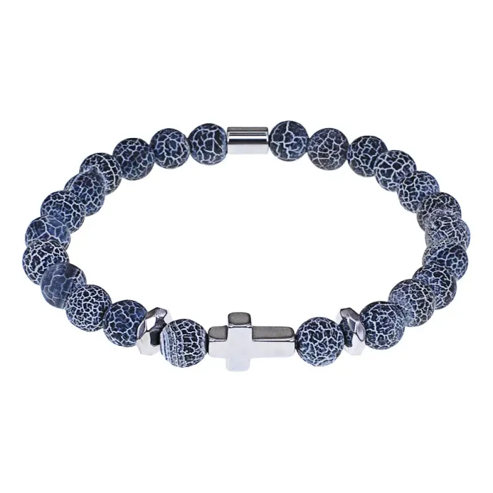 Христианский браслет Крест с нат.камнем синий Африканский агат 8мм BSHE-14-27