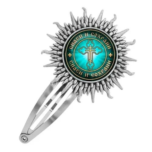 Заколка металлическая в серебристом цвете с изображением "Спаси и Сохрани" — это не только стильный аксессуар, но и символ защиты. Эта заколка выполнена из бижутерного сплава с покрытием под серебро и стекла, что придаёт ей элегантный вид. Размер заколки составляет 77 x 45 мм, а изображение защищено выпуклой стеклянной линзой, что обеспечивает долговечность и яркость деталей. Такой аксессуар станет прекрасным дополнением к любому наряду или замечательным подарком для близких. Традиция использования подобных символов восходит к древним временам, когда они служили оберегами для людей.
