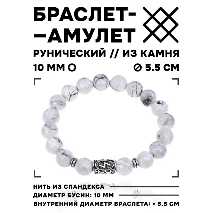 Стрейч-браслет с руной Соулу и бусинами из натурального камня кахолонг.