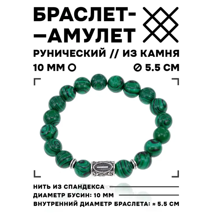 Стрейч-браслет с руной Иса и бусинами из синтетического малахита.