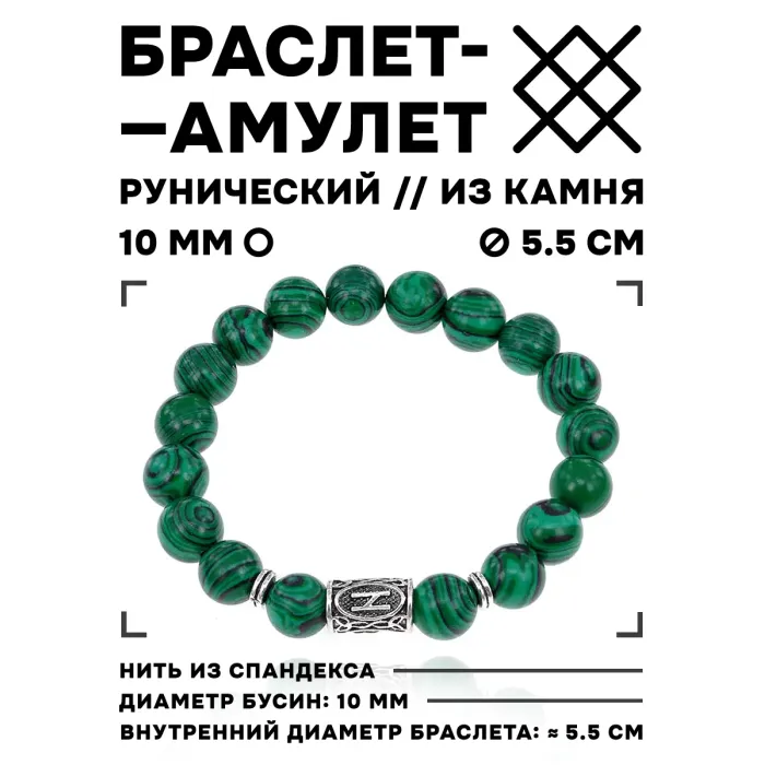 Стрейч-браслет с руной Хагалаз и бусинами из синтетического малахита.