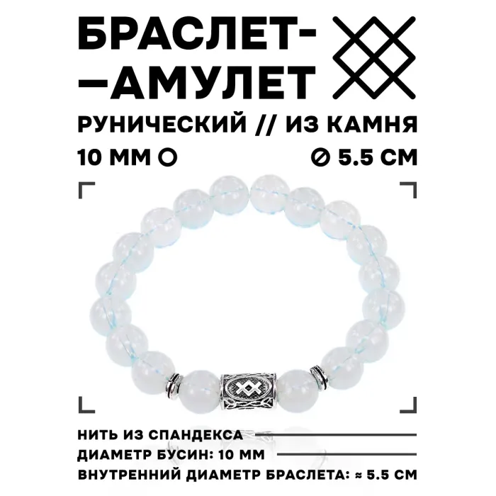 Размеры и комплектация: Внутренний диаметр браслета ~5.4 см (в диапазоне 5.2–5.6 см). Диаметр бусин 10 мм. В комплекте бархатный мешочек и буклет с описанием значений рун и свойств камней. Упаковка — прозрачный пакет с еврослотом.