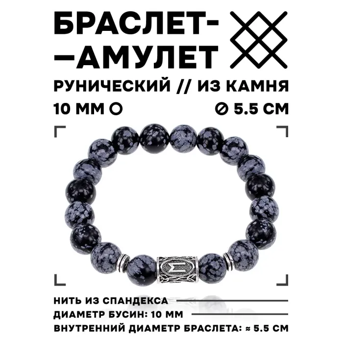 Стрейч-браслет с руной Эваз и бусинами из натурального снежного обсидиана.