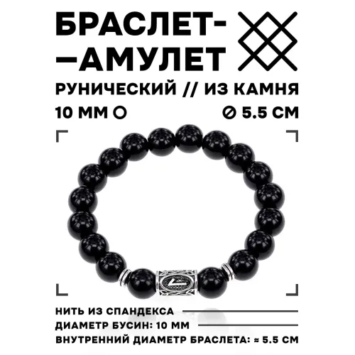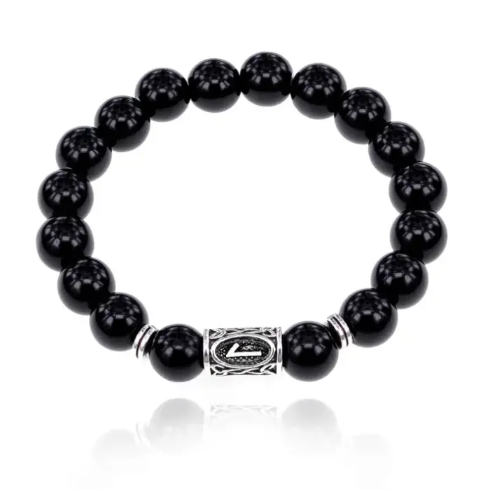 Стрейч-браслет с символом руны Лагуз и бусинами из натурального чёрного агата.