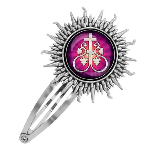 Заколка металлическая в изысканном дизайне с изображением креста и виноградной лозы. Этот аксессуар не только подчеркивает стиль, но и символизирует изобилие и процветание. Изготовлена из бижутерного сплава с покрытием под серебро и дополнена стеклянной линзой, что придает изделию особый шарм. Размер заколки составляет 77 x 45 мм, что делает её удобной для повседневного использования или особых случаев. Прекрасный выбор для любителей уникальных украшений.