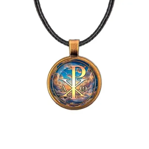 Кулон в цвете бронзы с изображением Хризмы — это не только стильный аксессуар, но и символ веры. Он идеально подходит для повседневного ношения или особых случаев.