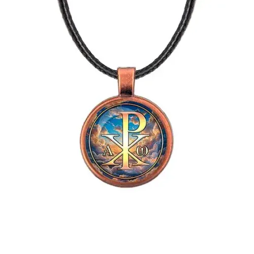 Кулон с изображением Хризмой — это не только стильное украшение, но и символ веры. Изготовленный из бижутерного сплава с покрытием под медь и стекла, он привносит в образ особую атмосферу.