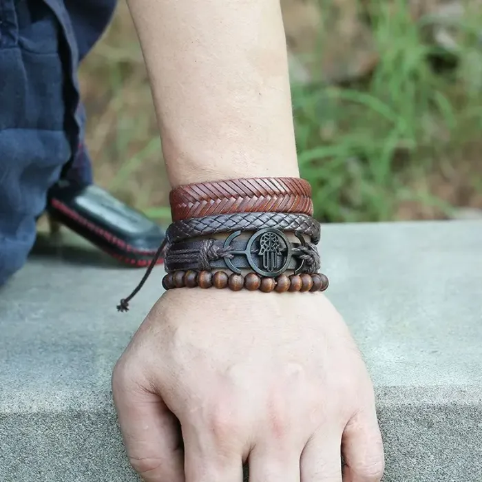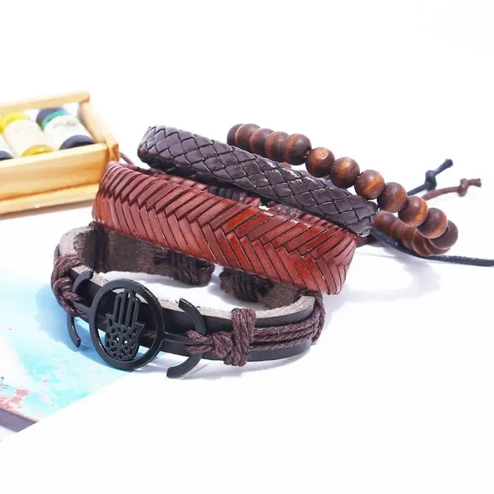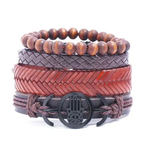 Набор 3 кожаных браслета, 1 деревянный BSN013