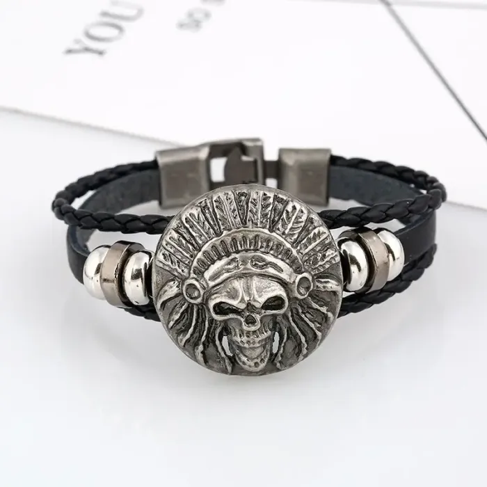 Кожаный браслет с уникальным дизайном в виде черепа индейца. Этот аксессуар не только подчеркивает индивидуальность, но и символизирует силу и мужество. Браслет выполнен из качественной кожи, что обеспечивает долговечность и комфорт при ношении. Размеры изделия составляют 35х170 мм, что делает его универсальным для большинства запястий. Застёжка надежно фиксирует браслет на руке, позволяя носить его в любых условиях.