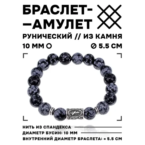 Стрейч-браслет с руной Наутиз из натурального камня снежный обсидиан.