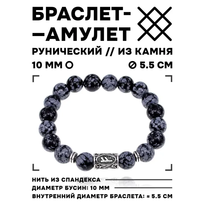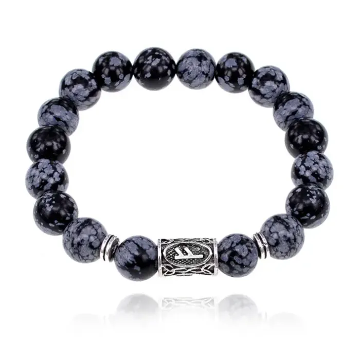 Стрейч-браслет с руной Феху и бусинами из снежного обсидиана.