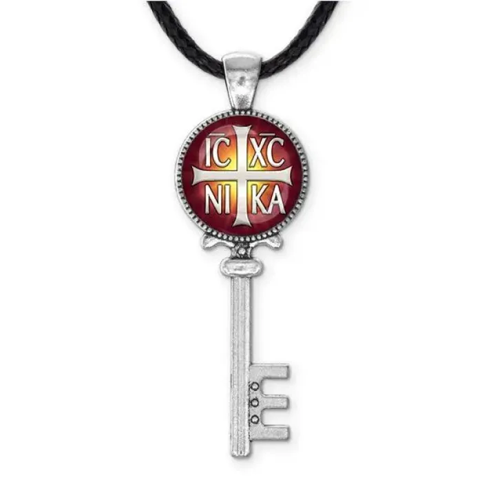 Кулон в форме ключа с изображением Креста Просфорного Константиновского. Материал — бижутерный сплав с покрытием под бронзу и стекло.