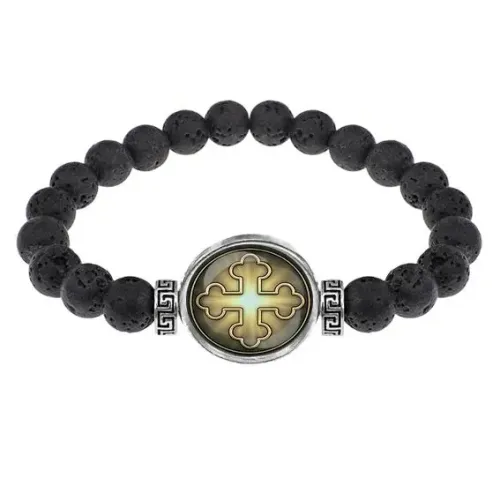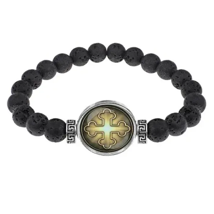 Стрейч-браслет из натуральной лавы диаметром 8 мм с изображением под выпуклой стеклянной линзой. Внутренний диаметр составляет около 5,5 см. Изготовлен из лавы, бижутерного сплава с покрытием под серебро и стекла. Лава известна своей способностью впитывать эфирные масла, что делает этот браслет идеальным для аромабижутерии. Нанесение нескольких капель эфирного масла на бусины позволяет создать уникальные ароматические композиции и наслаждаться их эффектом в течение дня. Этот аксессуар не только стильный элемент образа, но и практичный помощник для любителей ароматерапии.