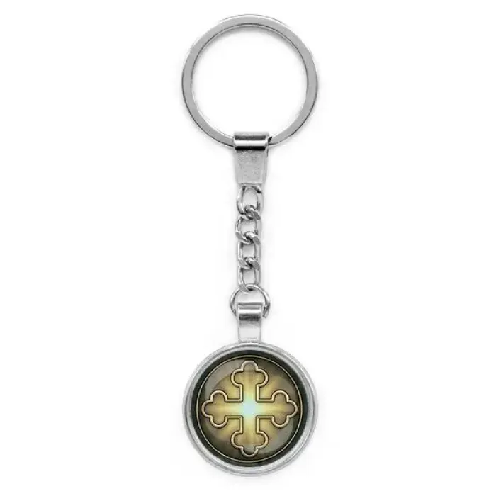 Круглый брелок с изображением креста трилистникового символизирует веру и надежду. Изготовлен из бижутерного сплава с покрытием под серебро и стекла, что придаёт ему элегантный вид. Размеры изделия (с кольцом и цепочкой) составляют 28х95 мм, а выпуклая стеклянная линза защищает изображение от повреждений. Этот стильный аксессуар станет прекрасным дополнением к ключам или сумке и будет напоминать о значимых моментах жизни.