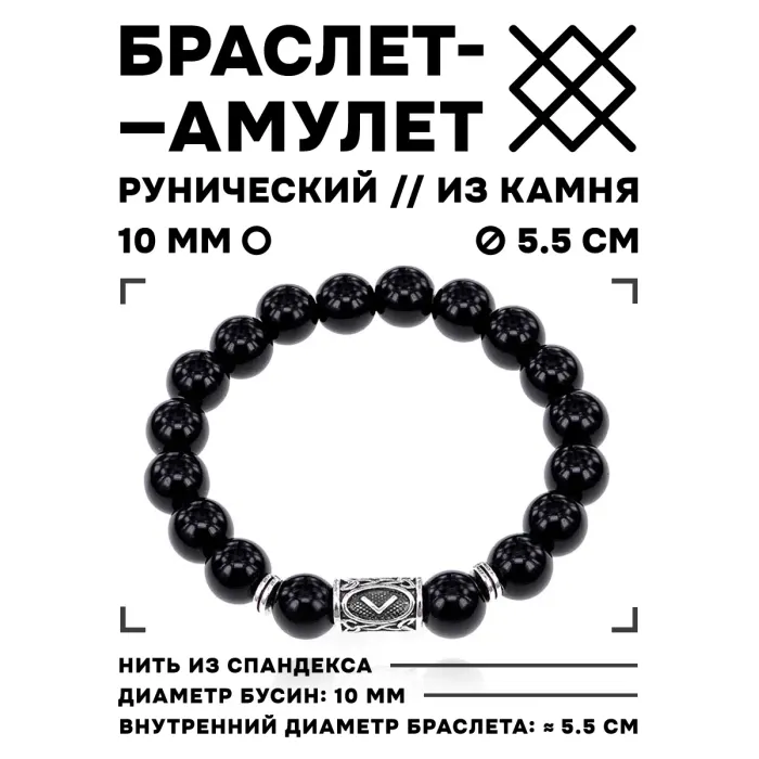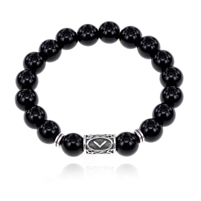 Стрейч-браслет с символом руны Кеназ и бусинами из натурального чёрного агата.