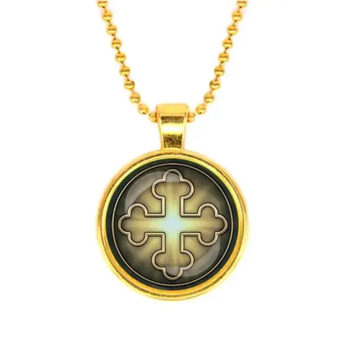 Кулон «Крест Трилистниковый» — это изысканное украшение, которое сочетает в себе элегантность и символику. Он выполнен из бижутерного сплава с покрытием под золото и дополнен стеклянной линзой, защищающей изображение. Основные особенности: