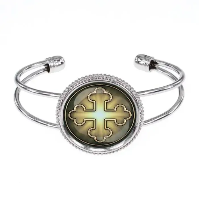 Браслет из бижутерного сплава с элегантным изображением креста трилистникового под выпуклой стеклянной линзой. Этот аксессуар не только подчеркнёт стильный образ, но и станет символом гармонии и единства. Размер браслета безразмерный, что делает его универсальным для любого запястья. Изготовлен из качественного бижутерного сплава с покрытием под серебро и стекла, он будет радовать своим блеском и долговечностью. Такой браслет может стать прекрасным подарком для близкого человека или дополнением к личной коллекции украшений.