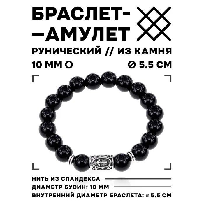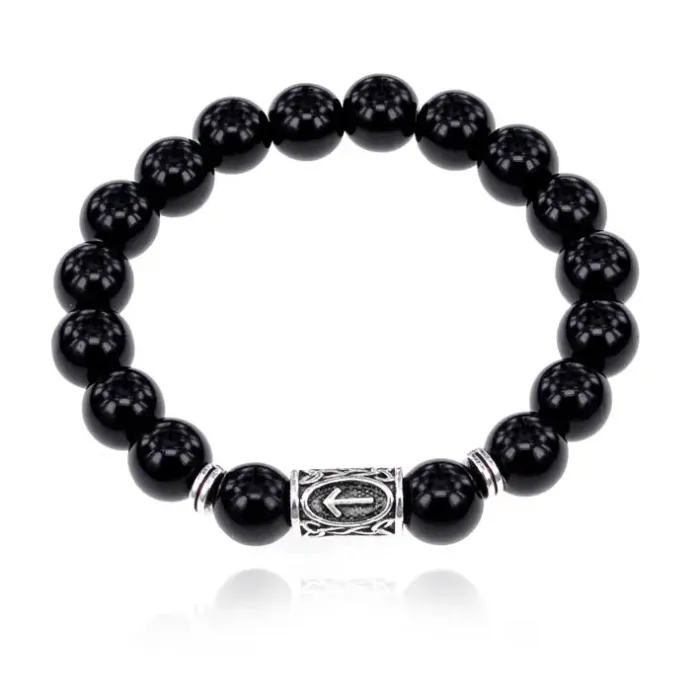 Стрейч-браслет с руной Тейваз и бусинами из натурального чёрного агата.