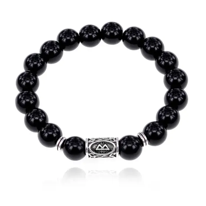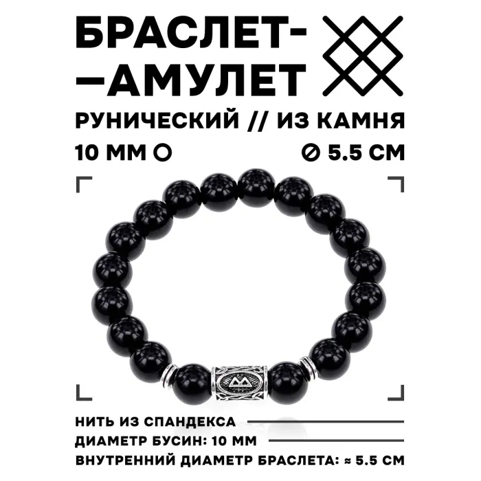 Стрейч-браслет с руной Беркана и бусинами из натурального чёрного агата.