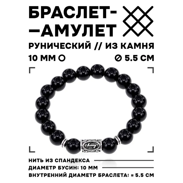 Стрейч-браслет с руной Эйваз и натуральным камнем черный агат.