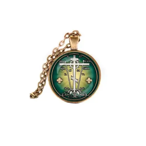 Кулон «Крест Голгофа» — это стильное украшение, выполненное из бижутерного сплава с покрытием под бронзу и стекла. Этот кулон не только привлекает внимание своим элегантным дизайном, но и несет в себе глубокий символический смысл, олицетворяя веру и надежду.