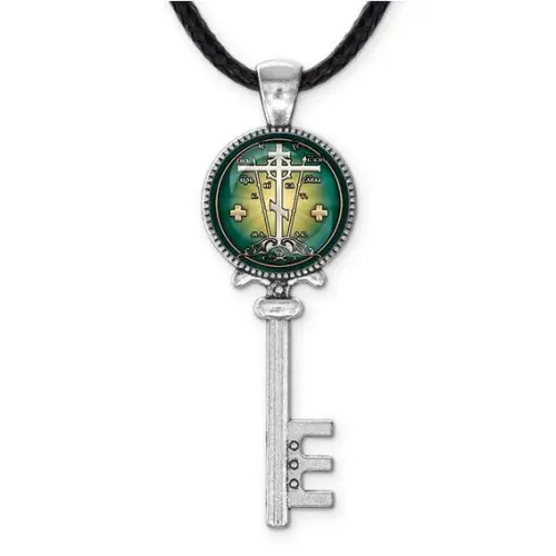 Кулон в виде ключа с изображением Креста Голгофа — это не только стильное украшение, но и символ веры. Изготовленный из бижутерного сплава с покрытием под бронзу и стекла, он станет ярким акцентом в любом образе. Размер кулона составляет 60 x 20 мм, а длина шнурка — 45 см. Застёжка замок типа лобстер обеспечивает надежную фиксацию. Изображение защищено выпуклой стеклянной линзой, что добавляет дополнительный шарм и защиту от повреждений. Этот кулон может стать прекрасным подарком или личным оберегом.