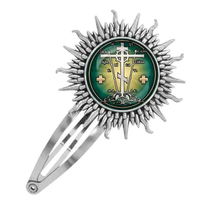 Заколка металлическая в цвете серебра с изображением Креста Голгофа — это стильный аксессуар, который подчеркивает индивидуальность и привносит нотку духовности в повседневный образ. Изготовленная из бижутерного сплава с покрытием под серебро и стеклом, она сочетает в себе прочность и элегантность.