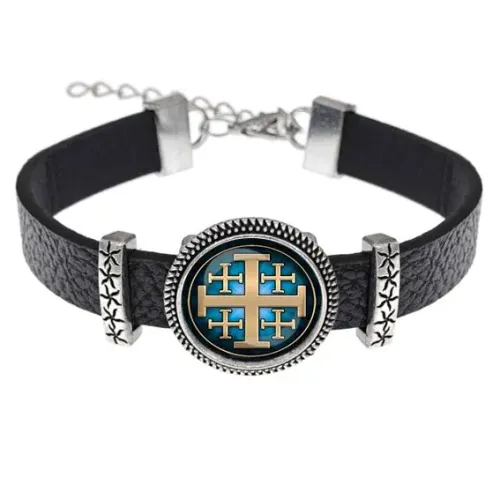 Кожаный браслет с изображением Креста Иерусалимского — это стильный аксессуар, который сочетает в себе символику и элегантность. Браслет выполнен из искусственной кожи и украшен выпуклой стеклянной линзой диаметром 20 мм, что придаёт ему особую выразительность.