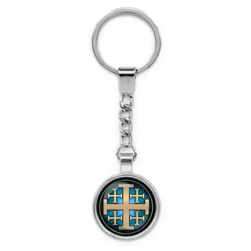 Круглый брелок в серебристом исполнении с изображением Креста Иерусалимского — это не только стильный аксессуар, но и символ веры. Он идеально подходит для использования в качестве ключницы или элемента декора.