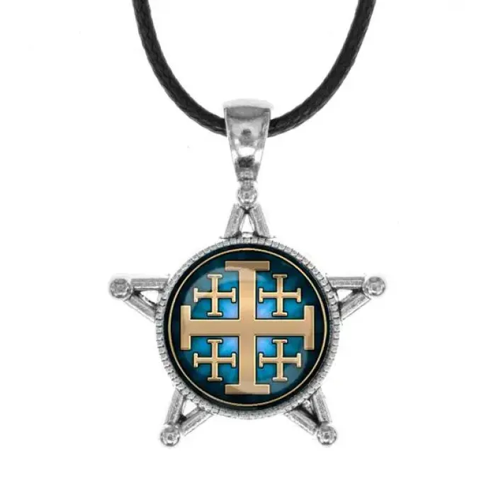 Звезда-кулон с изображением Иерусалимского креста — это изысканный аксессуар, который сочетает в себе духовный символизм и стильный дизайн. Этот кулон выполнен из бижутерного сплава под серебро и украшен стеклом, что придаёт ему особую привлекательность.