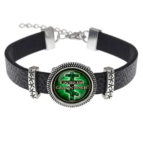 Браслет из кожи с глубоким смыслом и символикой. Он украшен изображением диаметром 20 мм под выпуклой стеклянной линзой, что придаёт ему уникальный вид. Регулируемый размер позволяет носить изделие на любой руке, а материалы — искусственная кожа и бижутерный сплав с покрытием под серебро — обеспечивают долговечность и стиль. Стекло добавляет элегантности и защищает изображение от повреждений. Этот аксессуар станет не только модным дополнением к образу, но и напоминанием о духовных ценностях.