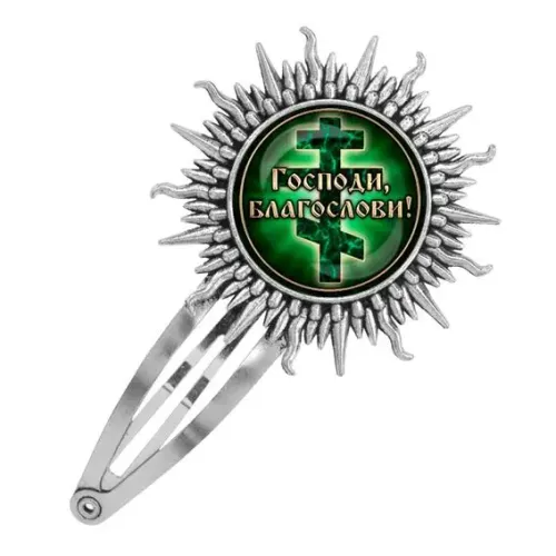 Металлическая заколка в серебристом цвете с надписью "Господи, Благослави!" является стильным аксессуаром с глубоким символическим значением. Она выполнена из бижутерного сплава с покрытием под серебро и дополнена стеклянной линзой, защищающей изображение. Размер заколки составляет 77 x 45 мм, что делает её удобной для использования в повседневной жизни или на особых мероприятиях. Этот аксессуар не только украшает прическу, но и несет в себе пожелание благословения и удачи. Заколка станет отличным подарком для близких или просто приятным дополнением к личной коллекции.