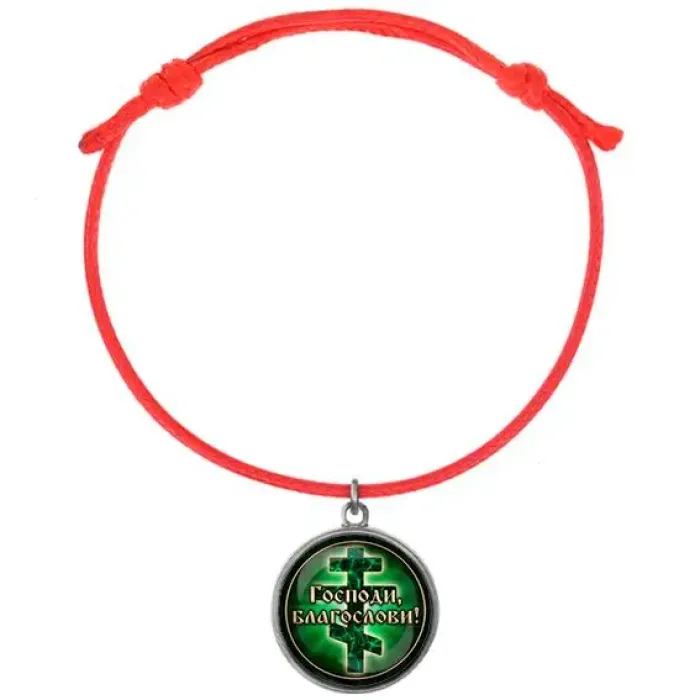 Браслет из красного шнура с надписью "Господи, Благослави!" символизирует защиту и благословение. Этот стильный аксессуар подходит как для повседневной носки, так и для особых случаев. Металлическая подвеска с полиграфической вставкой под выпуклым стеклом добавляет элегантности и выразительности. Диаметр изображения составляет 20 мм, что делает его заметным акцентом на запястье. Браслет может стать отличным подарком или личным оберегом.