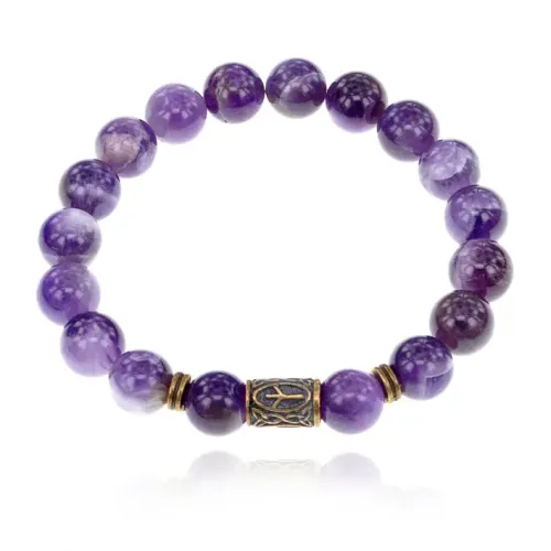 Славянский рунический стрейч-браслет из натурального камня аметист с символом руны Мир.