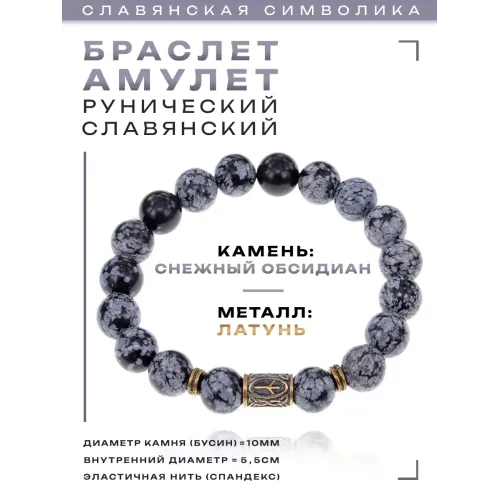 Славянский рунический браслет из натурального камня снежный обсидиан с символом Чернобог.