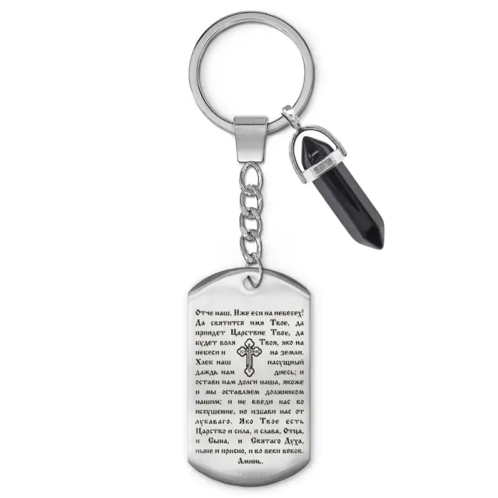 Брелок с молитвой «Отче наш» и подвеской из натурального черного агата — это не просто аксессуар, а символ духовной связи и защиты. Изображение выполнено методом гравировки на одной стороне жетона, что придаёт ему уникальность и выразительность.