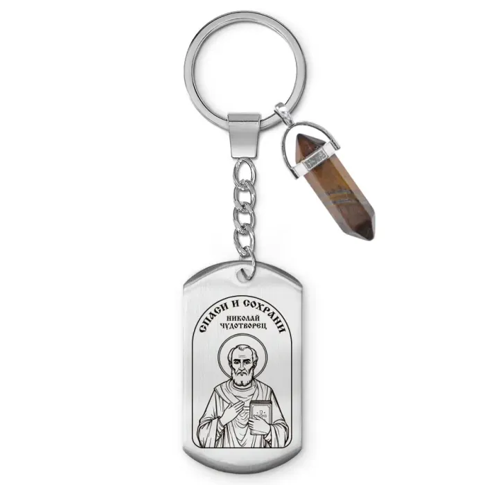 Брелок с изображением Святого Николая Чудотворца — это не просто аксессуар, а символ надежды и поддержки в трудные времена. Этот жетон выполнен из качественного сплава и украшен натуральным камнем тигровый глаз, который традиционно ценится за свою способность приносить удачу и защищать от негативных влияний.