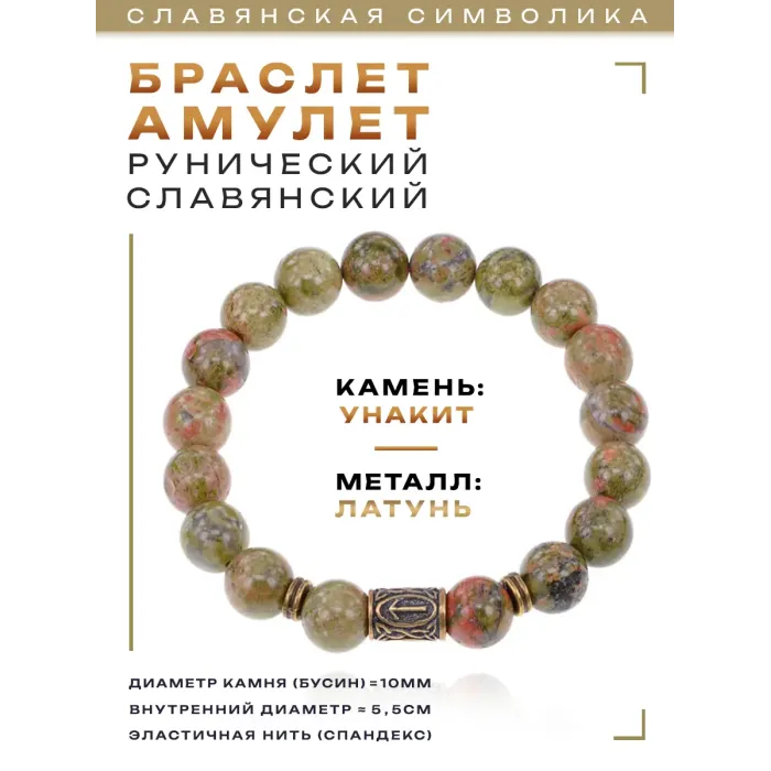 Славянский рунический стрейч-браслет из натурального камня унакит с символом руны Треба.