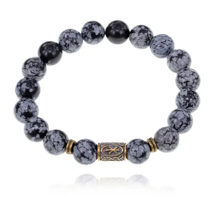 Славянский рунический стрейч-браслет с натуральным камнем Снежный обсидиан и символом руны Рок.