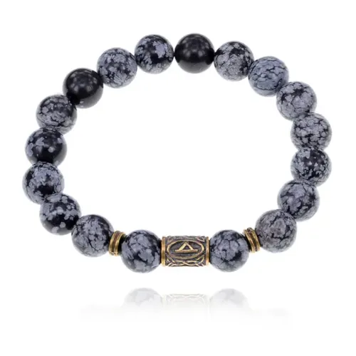 Славянский рунический стрейч-браслет из натурального камня снежный обсидиан с символом руны Даждьбог.