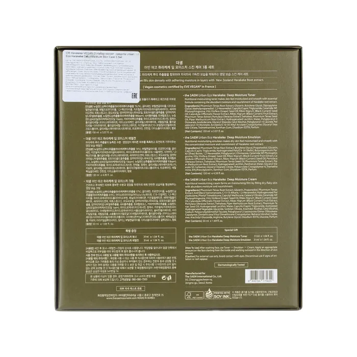 Набор Urban Eco Harakeke Deep Moisture Skin Care 3 Set от The Saem включает в себя три средства для комплексного ухода за кожей лица: тонер, эмульсию и крем. Основным активным компонентом набора является экстракт новозеландского льна (Phormium Tenax), который известен своими увлажняющими и успокаивающими свойствами. Средства из этого набора способствуют смягчению кожи, укреплению ее структуры и поддержанию здоровья в глубоких слоях эпидермиса.