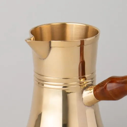Корпус турки изготовлен из латуни, устойчивой к коррозии. Съёмная ручка выполнена из дерева, что облегчает мытьё и хранение. Поверхность украшена ручной росписью и чеканкой.
