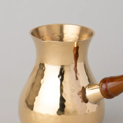 Корпус турки выполнен из латуни — материала, устойчивого к коррозии. Ручная роспись и чеканка создают декоративную поверхность. Съёмная ручка из дерева упрощает мытьё и хранение.