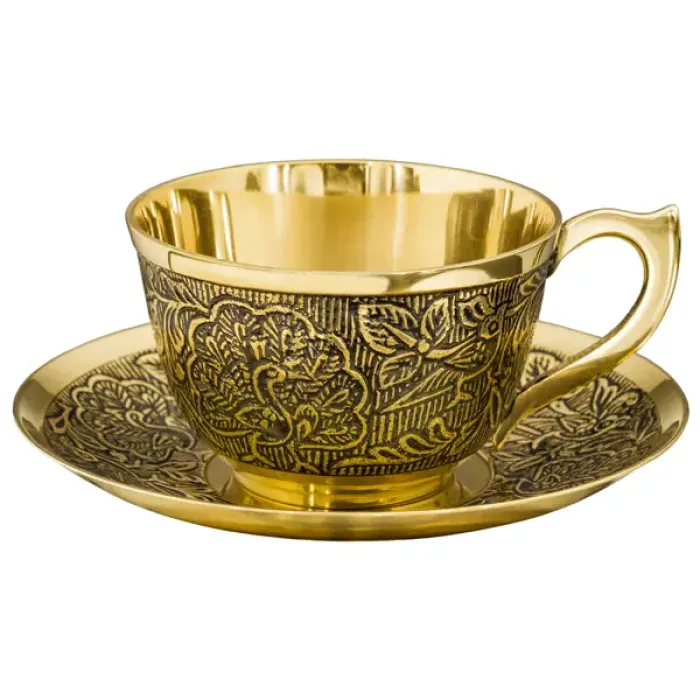 Посуда выполнена из высококачественного материала, устойчивого к коррозии. Поверхность имеет полированную отделку, имитирующую стиль под старину. Конструкция включает чашку и блюдце, предназначенные для классической сервировки.