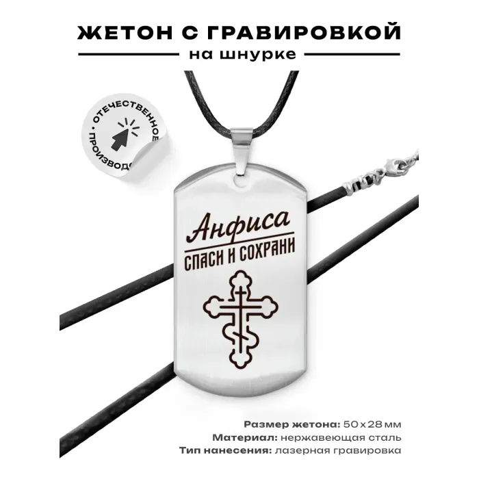 Именной жетон на шнурке Анфиса — это стильный и практичный аксессуар, выполненный из высококачественной нержавеющей стали. Он станет отличным подарком или уникальным элементом для повседневного использования. Жетон украшен гравировкой, которая наносится на одну сторону изделия, что придаёт ему индивидуальность.