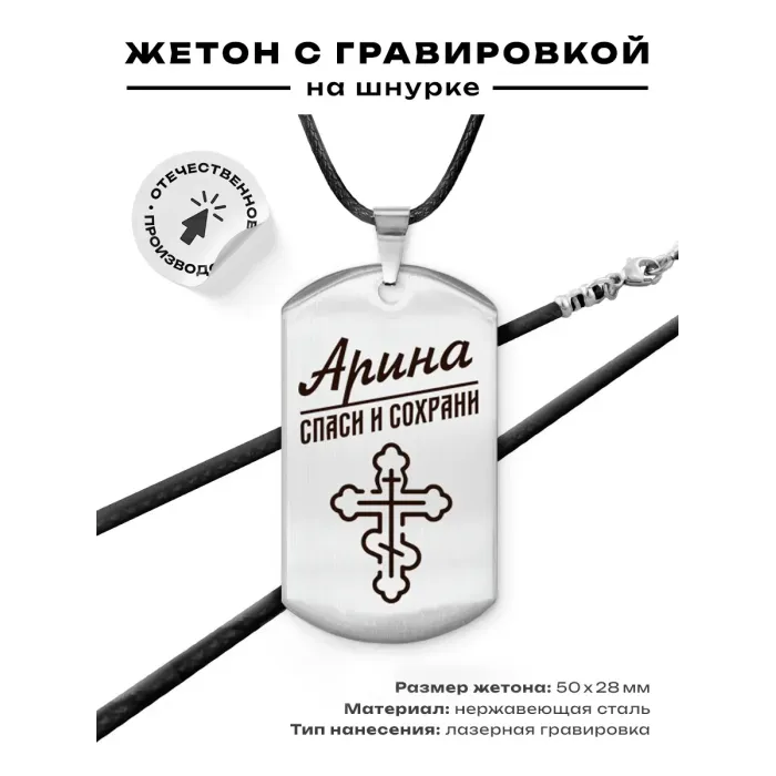 Именной жетон на шнурке — это стильный и практичный аксессуар, который станет отличным подарком для близких. Изготовленный из высококачественной нержавеющей стали, этот жетон отличается прочностью и долговечностью. Гравировка изображения выполняется с одной стороны изделия, что придаёт ему уникальность и индивидуальность.