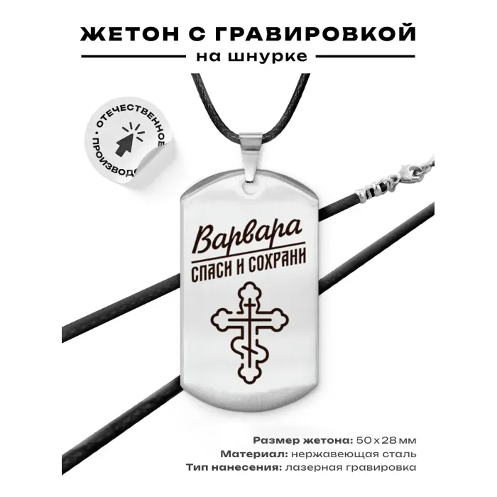 Именной жетон на шнурке Варвара — это стильный и практичный аксессуар, выполненный из высококачественной нержавеющей стали. Этот жетон станет отличным подарком или оригинальным способом подчеркнуть индивидуальность.